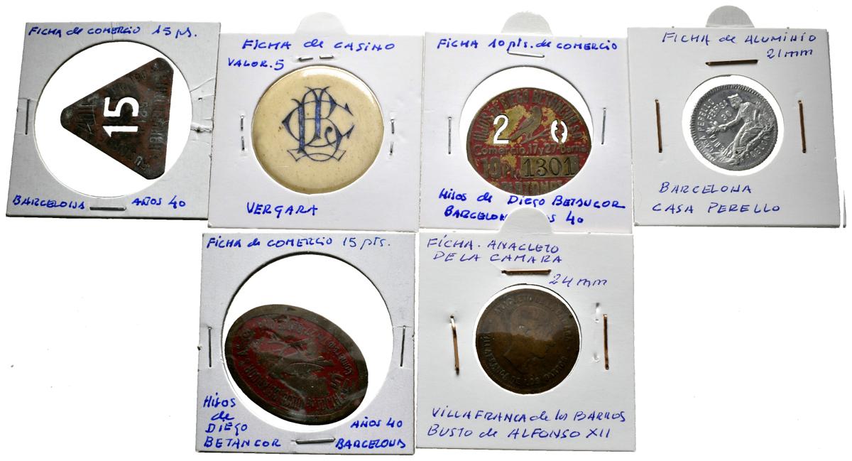 FICHAS. Conjunto de 6 fichas de comercio y casino, la gran mayoría de ellas acuñadas en Barcelona en la década de los 40 del siglo pasado. Destacan dos piezas con valor comercial de 10 y 15 Pesetas de la empresa canaria Hijos de Diego Betancor para su uso en el mercado barcelonés del Borne. Diferentes estados de conservación. A EXAMINAR.