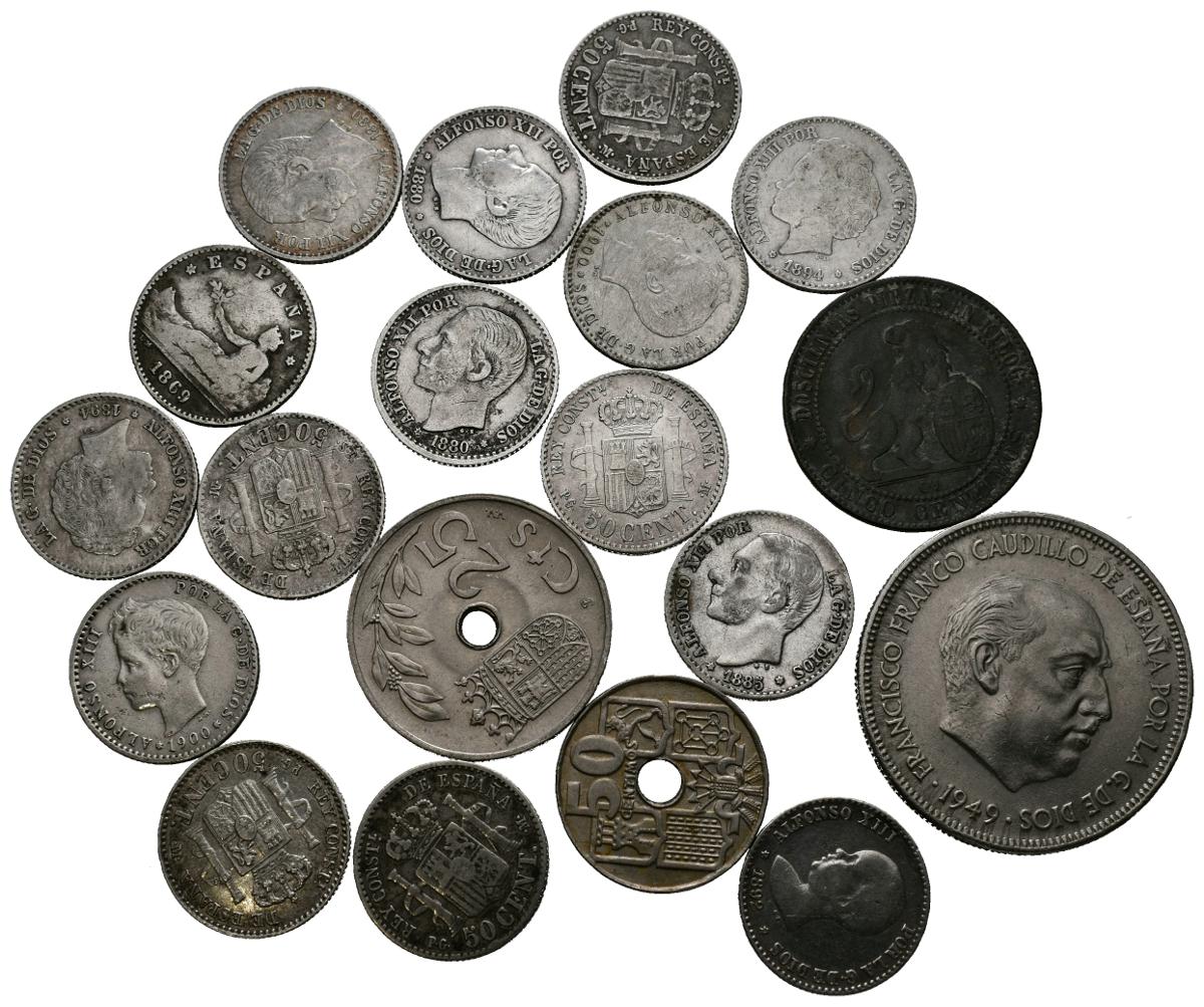 CENTENARIO DE LA PESETA y ESTADO ESPAÑOL. Conjunto compuesto por 20 monedas de las cuales 16 son de 50 Céntimos de acuñados entre el Gobierno Provisional y Alfonso XIII, 1 moneda de 5 Céntimos del Gobierno Prvisional y 3 monedas del Estado Español. A EXAMINAR.