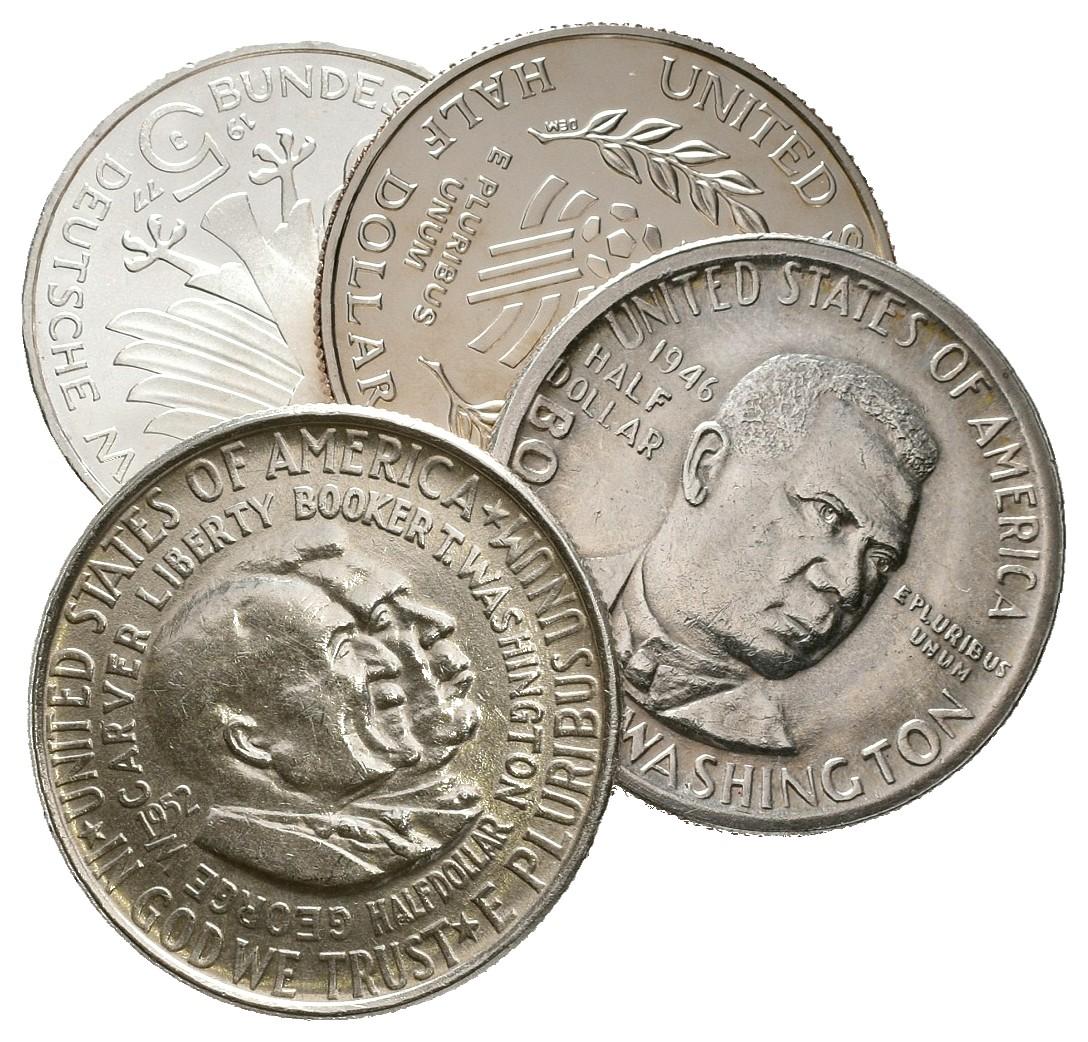 MONEDAS EXTRANJERAS. Bonito conjunto formado por 4 monedas de plata, 3 de ellas de 1/2 dollar acuñadas en 1946, 1952 y 1994 en los Estados Unidos y 1 pieza de Alemania de 5 Marks de 1977. Alto nivel de conservación en general. A EXAMINAR.