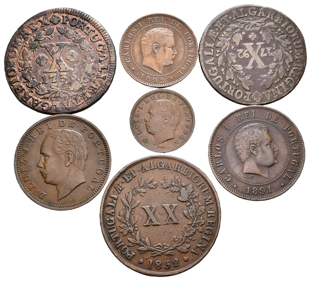 MONEDAS EXTRANJERAS. Conjunto de 7 monedas de cobre de Portugal de los siglos XVIII y XIX. Diferentes módulos y estados de conservación. A EXAMINAR.