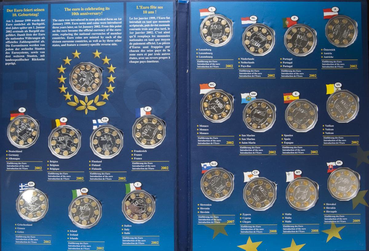 MONEDAS EXTRANJERAS. Conjunto de 2 álbumes de 15 y 20 monedas cada uno, respectivamente, emitidos en conmemoración del 10 aniversario de la creación del Euro en Alemania. PROOF. Todas las monedas de cobre chapado en plata y oro.