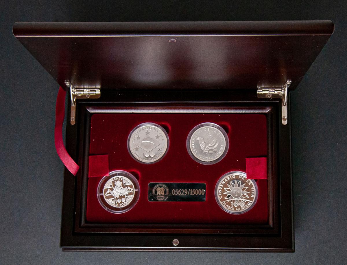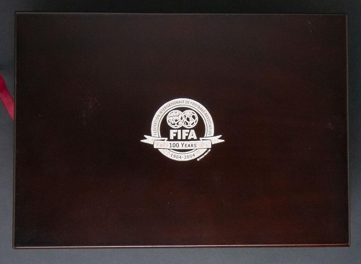 FIFA 100 Años (1904-2004). Precioso estuche original y de madera que incluye 4 monedas (Brasil, Suiza, Francia y Uruguay) en plata conmemorativas del Centenario de esta Federación Internacional de Fútbol. 2002. Sólo 15 mil estuches emitidos. Incluye certificado de autenticidad. PROOF.