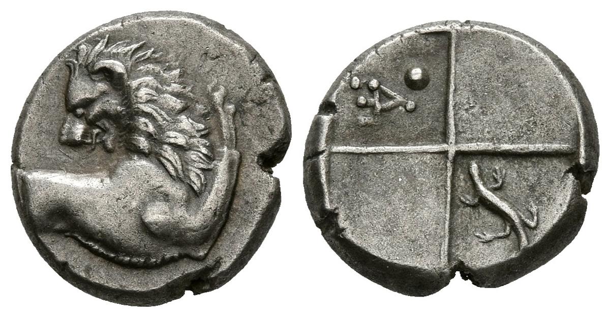 CHERSONESOS, Tracia. Hemidracma. 400-350 a.C. A/ Parte delantera de león a izquierda con cabeza vuelta. R/ Cuatro cuadros incusos, primer cuartel monograma con punto y lagartija. McClean 4117; Weber 2415; SNG Copenhagen 830. Ar. 2,49g. MBC+.