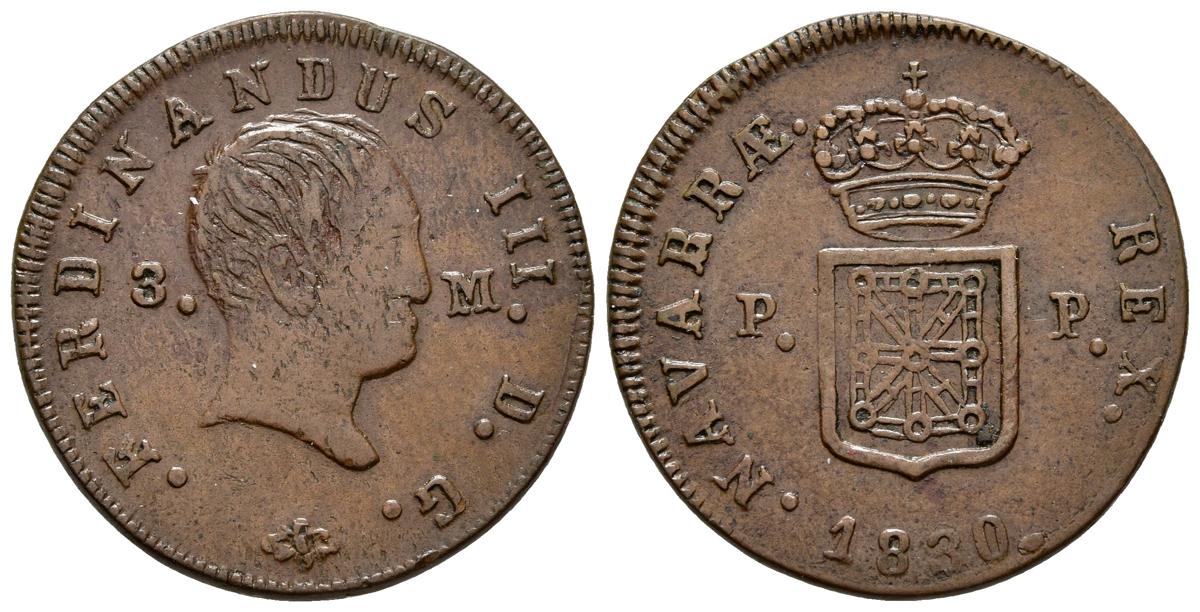 FERNANDO VII. 3 Maravedís. 1830. Pamplona. Roseta de cuatro pétalos bajo el busto. Cal-1646. Ae. 5,50g. MBC+.