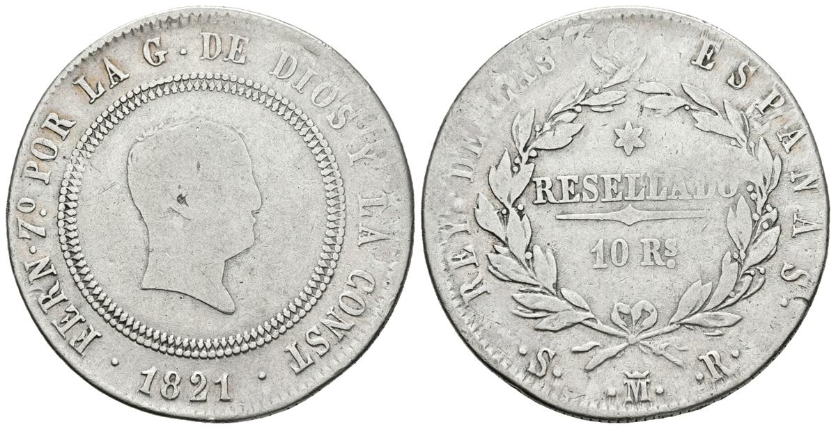 FERNANDO VII. 10 Reales. 1821. Madrid SR. Cal-762. Ar. 13,43g. Acuñada sobre un módulo de ¿4 Reales?. BC+.