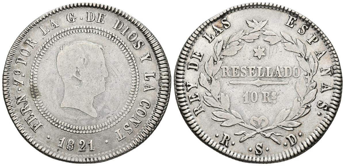 FERNANDO VII. 10 Reales. 1821. Sevilla RD. Tipo "Cabezón". Cal-822. Ar. 13,09g. BC+/MBC-. Ex. Aureo 28-04-1999 Nº2523.