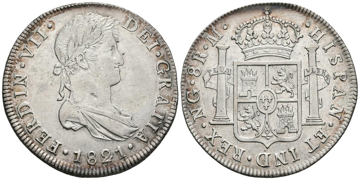 FERNANDO VII. 8 Reales. 1821. Guatemala M. Cal-470. Ar. 26,89g. Conserva parte del brillo original. EBC-/EBC+.