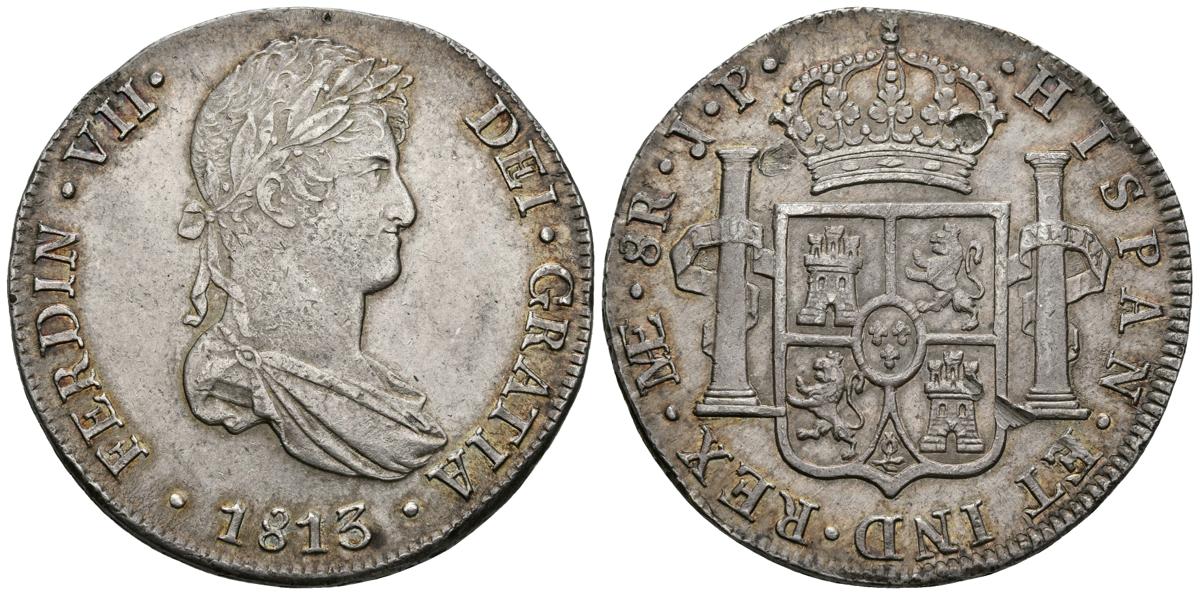 FERNANDO VII. 8 Reales. 1813. Lima JP. Cal-480. Ar. 26,48g. Preciosa pátina. Golpes en reverso. EBC-.
