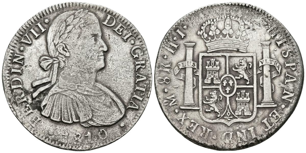 FERNANDO VII. 8 Reales. 1810. México HJ. Busto imaginario. Cal-543. Ar. 26,78g. Oxidaciones limpiadas. MBC-. Escasa.