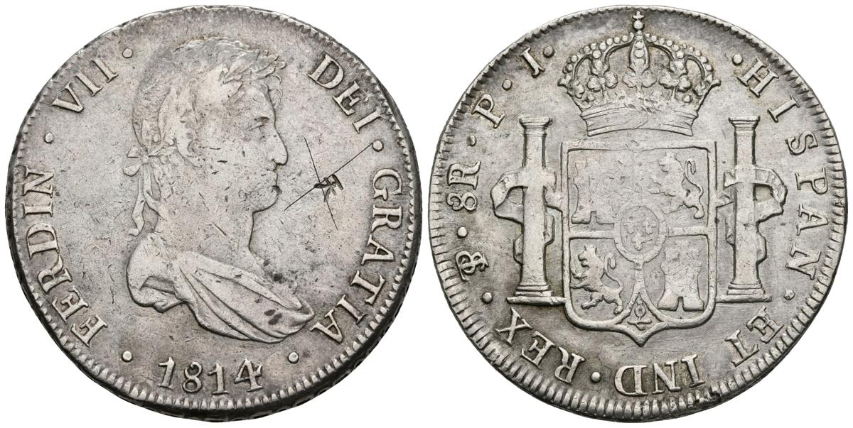 FERNANDO VII. 8 Reales. 1814. Potosí PJ. Cal-603. Ar. 26,93g. Resello chino y graffiti en anverso. MBC.