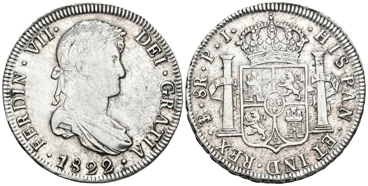 FERNANDO VII. 8 Reales. 1822. Potosí PJ. Cal-611. Ar. 26,88g. Mínimas rayitas por limpieza. EBC-.