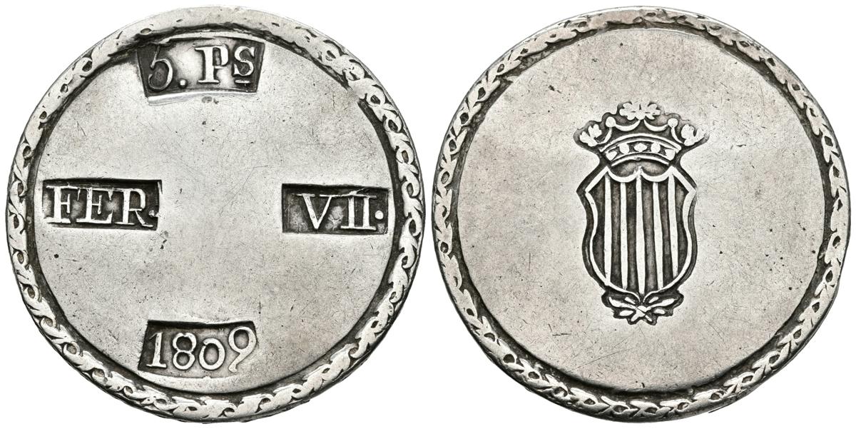 FERNANDO VII. 5 Pesetas. 1809. Tarragona. Escudo grande. Cal-653. Ar. 12,60g. MBC+.