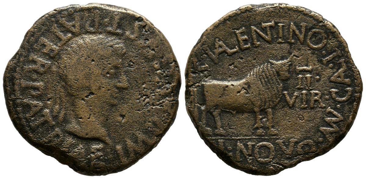 CALAGURRIS. As. Epoca de Octavio. 27 a.C.-14 d.C. Calahorra (La Rioja). A/ Cabeza laureada de Octavio a derecha. IMP AVGVST PATER PATRIAE. R/ Toro parado a derecha, delante II-VIR, alrededor L VALENTINO L NOVO M CAL I. FAB-418. Ae. 13,42g. BC+/MBC.