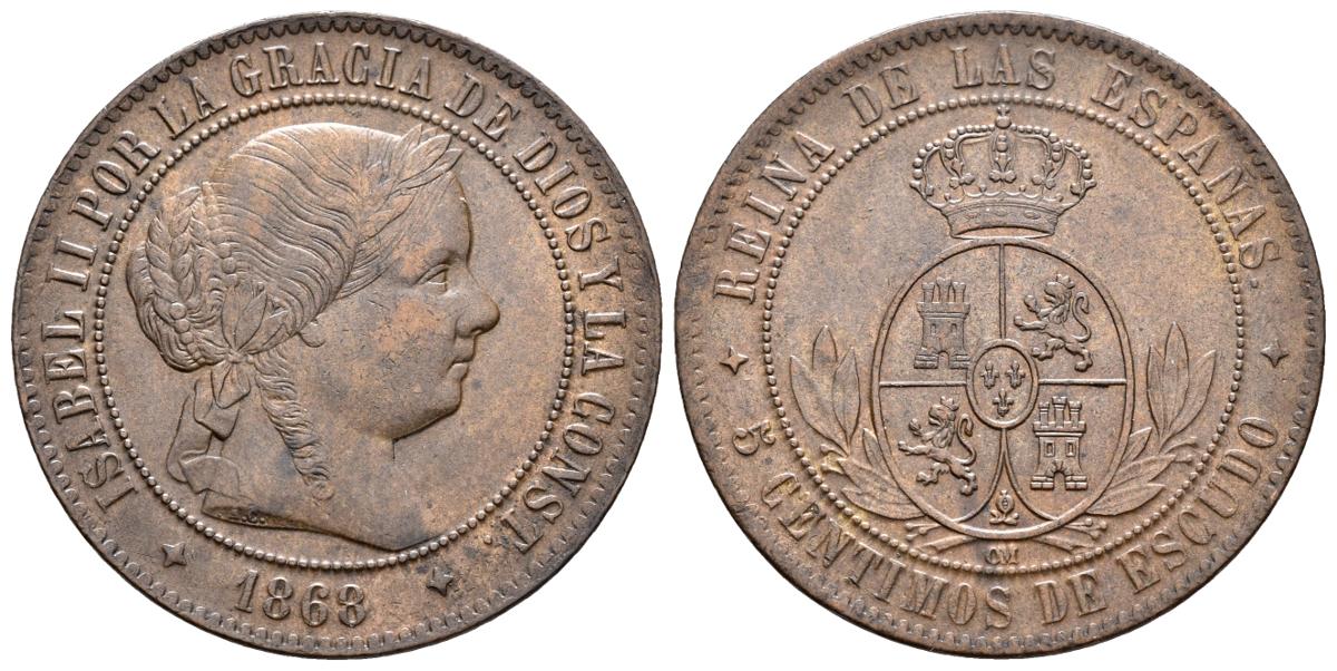 ISABEL II. 5 Céntimos de Escudo. 1868. Jubia OM. Cal-629. Ae. 12,71g. EBC-.