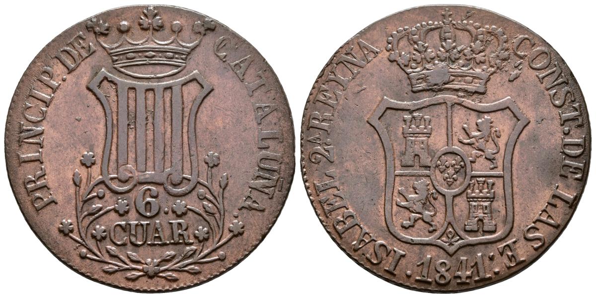 ISABEL II. 6 Cuartos. 1841. Barcelona. Flores de 5 pétalos. Cal-689. Ae. 13,92g. MBC.