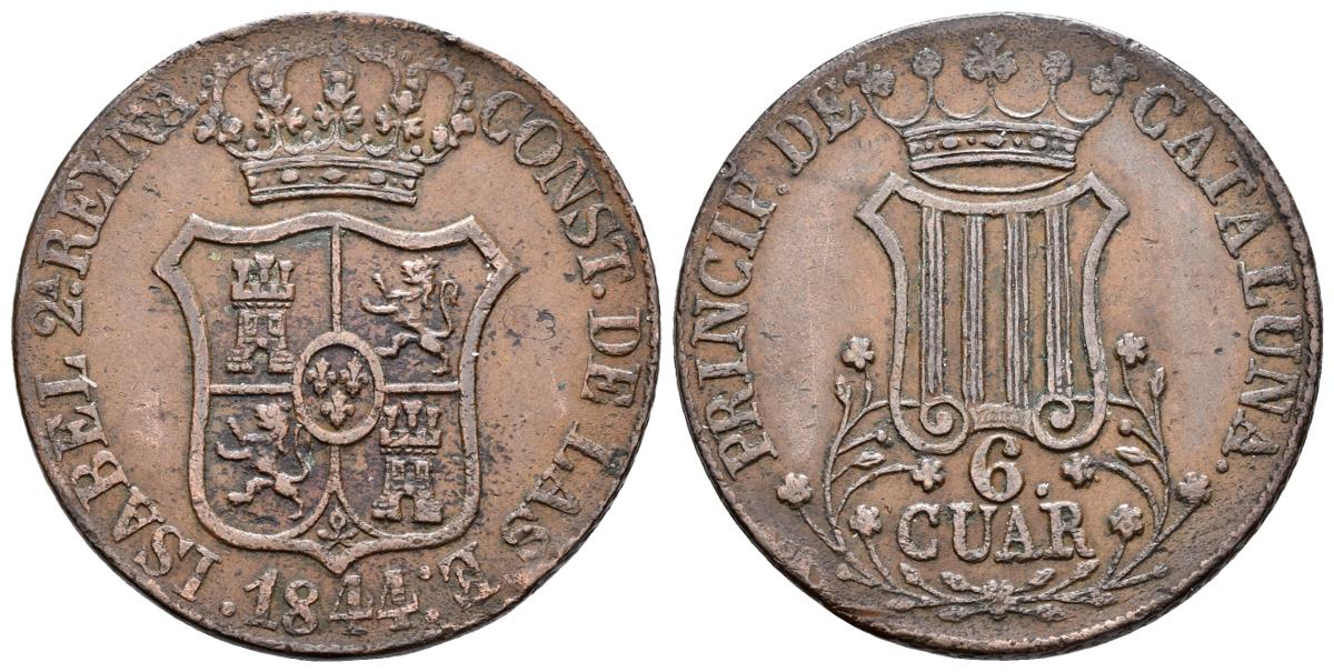 ISABEL II. 6 Cuartos. 1844. Barcelona. Flores de 5 pétalos. Cal-693. Ae. 14,16g. MBC.
