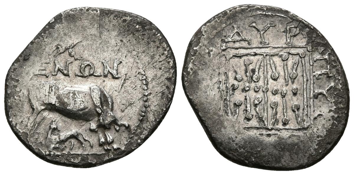 ILLYRIA, Dyrrhachion. Dracma. 250-200 a.C. A/ Vaca parada a derecha con cabeza vuelta mirando a ternero lactante, encima leyenda y sobre ella cuervo. R/ Doble estrellado dentro de cuadrado que representa el jardín de Alkinoos, alrededor leyenda griega. Ceka No cita; Maier 201; SNG Copenhagen 467. Ar. 2,99g. MBC-.