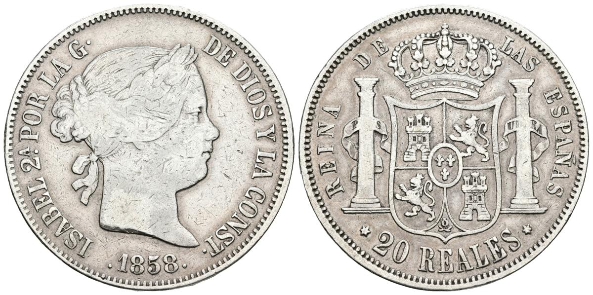 ISABEL II. 20 Reales. 1858. Madrid. Cal-180. Ar. 25,51g. BC+/MBC-.
