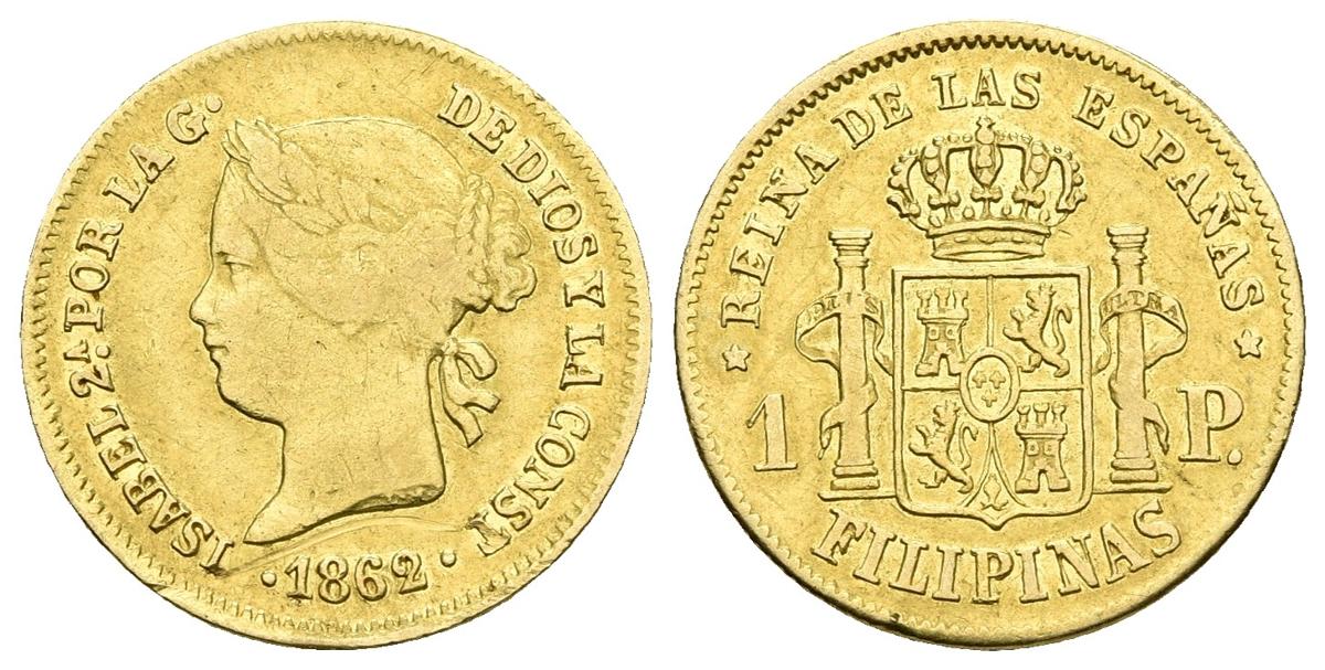 ISABEL II. 1 Peso. 1862/1 Sobrefecha. Manila. Cal-143var. Au. 1,74g. Rayita en anverso. BC+/MBC-.