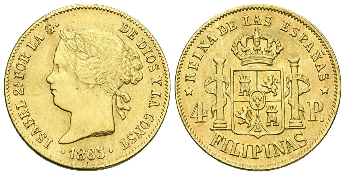 ISABEL II. 4 Pesos. 1865. Manila. Cal-129. Au. 6,71g. Rayitas en anverso. MBC+.
