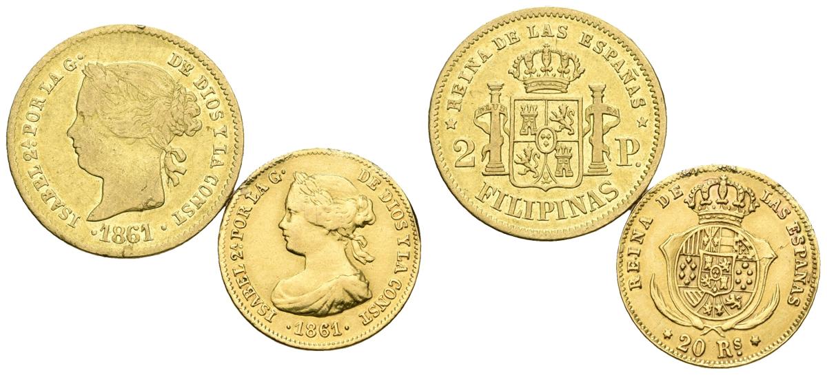 ISABEL II. Lote compuesto por 2 monedas de oro, conteniendo: 2 Pesos. 1861. Manila y 20 Reales. 1861. Madrid. (Utilizada como joya) Cal-133 y 119. Au. 3,35g y Au. 1,68g. BC+/MBC.
