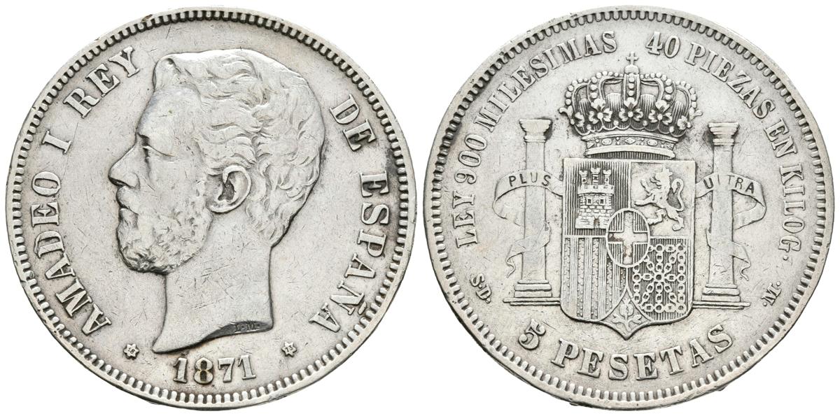 AMADEO I. 5 Pesetas. 1871 *18-73. Madrid DEM. Cal-9. Ar. 24,84g. Marquitas. MBC-. Muy escasa.
