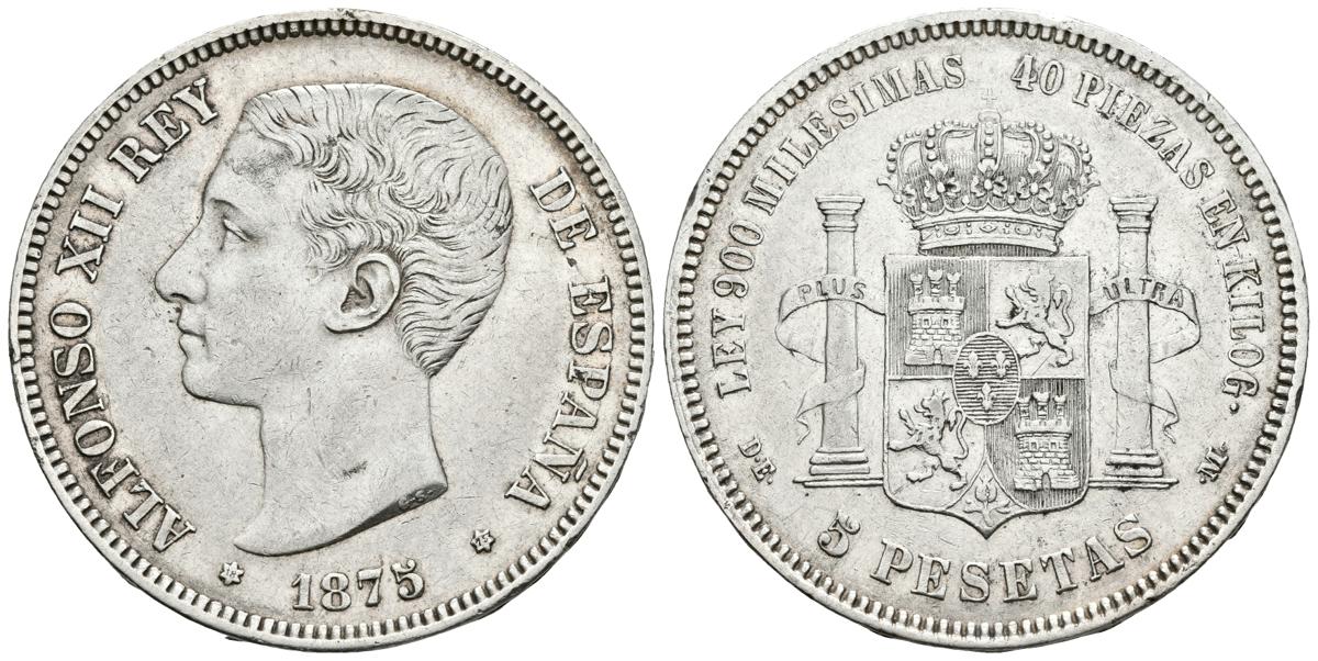 ALFONSO XII. 5 Pesetas. 1875 *18-75. Madrid DEM. Cal-25a. Ar. 25,25g. MBC.