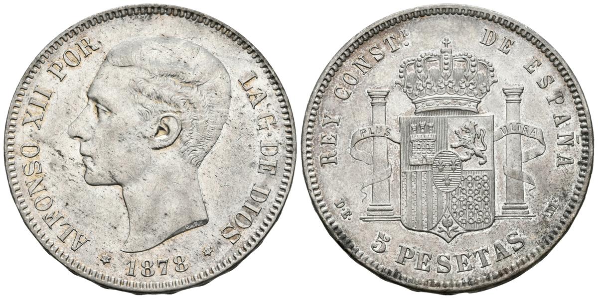 ALFONSO XII. 5 Pesetas. 1878 *18-78. Madrid DEM. Cal-29. Ar. 24,96g. Conserva parte del brillo original. Marquitas. MBC+/EBC-.