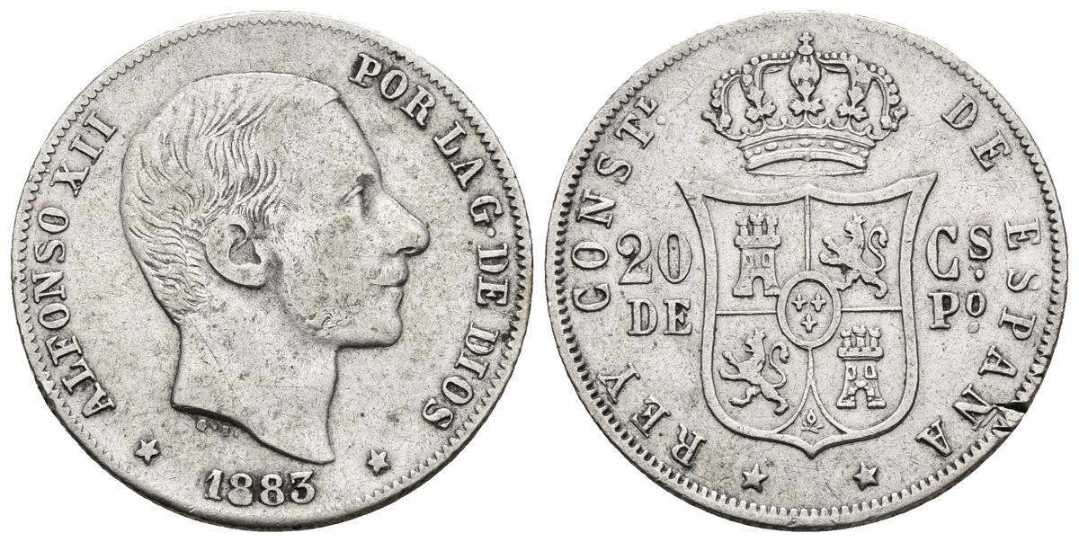 ALFONSO XII. 20 Centavos de Peso. 1883. Manila. Cal-90. Ar. 5,10g. Dos pruebas de metal en el canto. MBC-.