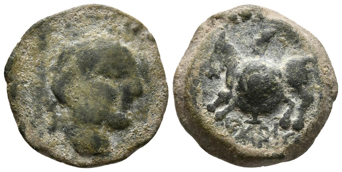 CARISA. Semis. 50 a.C. Bornos (Cádiz). A/ Cabeza masculina a derecha. R/ Jinete con lanza y rodela a izquierda, debajo CARIS. FAB-452. Ae. 6,40g. BC+.