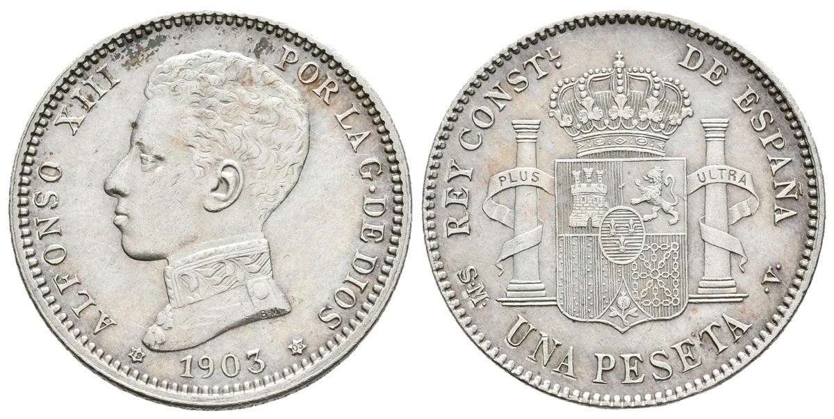 ALFONSO XIII. 1 Peseta. 1903 *19-03. Madrid SMV. Rara rectificación sobre el 3. Cal-49var. Ar. 5,04g. EBC-.