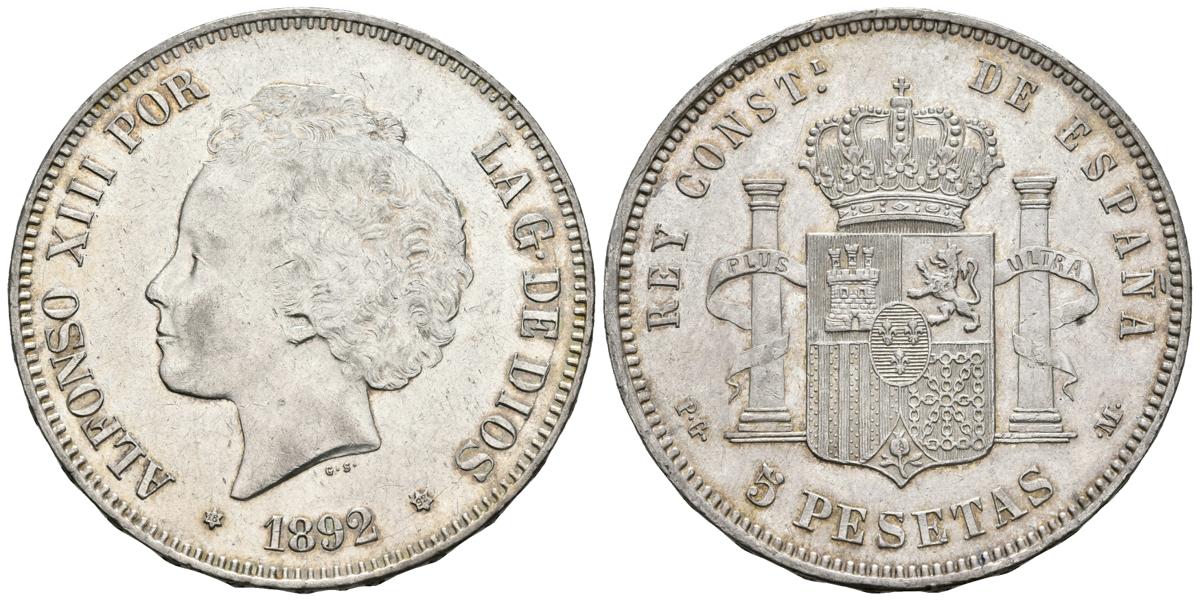 ALFONSO XIII. 5 Pesetas. 1892 *18-92. Madrid PGM. Tipo "Bucles". Cal-19. Ar. 25,07g. Bella. Mínimas marquitas. EBC.