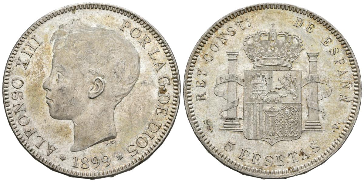 ALFONSO XIII. 5 Pesetas. 1899 *18-99. Madrid SGV. Cal-28. Ar. 24,74g. Brillo original, marquitas en anverso. SC-.