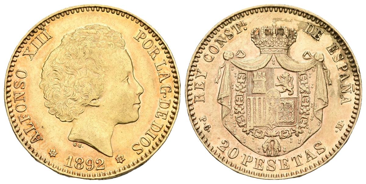 ALFONSO XIII. 20 Pesetas. 1892 *18-92. Madrid PGM. Tipo "Bucles". Cal-6. Au. 6,45g. MBC. Rara.