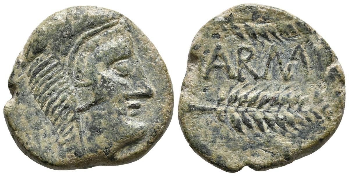 CARMO. As. 80 a.C. Carmona (Sevilla) A/ Cabeza de Hércules a derecha. R/ Dos espigas a derecha, entre ambas CARMO. FAB-466 como semis. Ae. 11,05g. MBC-.