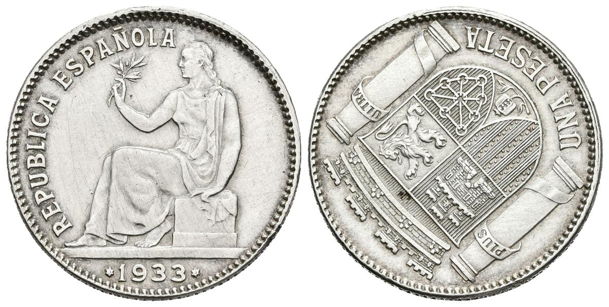 II REPUBLICA. 1 Peseta. 1933 *3-4. Reverso girado 45º. Cal-1. Ar. 4,98g. MBC+.