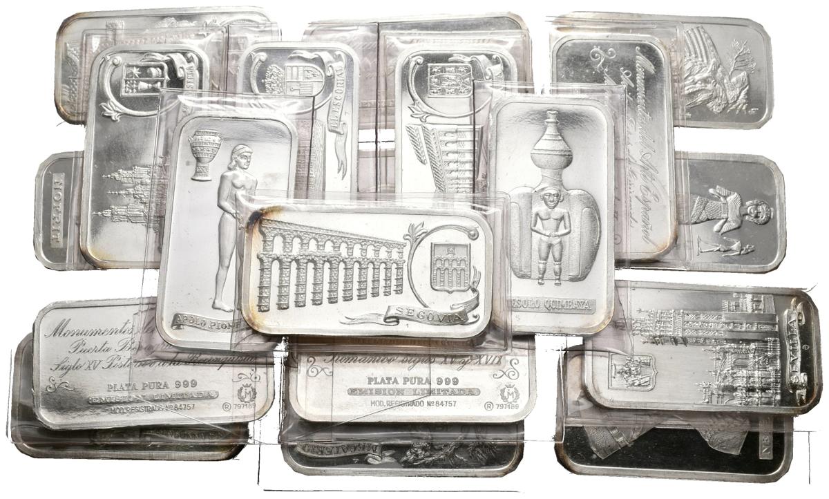 COLECCION DE LINGOTES. Compuesto por 19 lingotes de plata pura (27g aproximadamente) sobre Monumentos del arte Español (8), Historia de la escultura (5) y Fauna universal (6). Ar. SC.