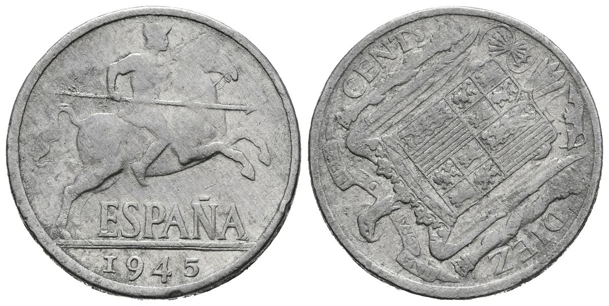 ESTADO ESPAÑOL. 10 Céntimos. 1945. Reverso girado 40º. Cal-130. Cu-Ni. 1,82g. MBC-.