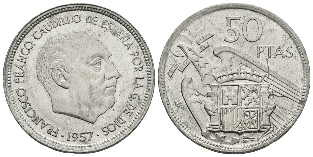 ESTADO ESPAÑOL. 50 Pesetas. 1957 *59. Cuño roto en reverso. 12,55g. PROOF.