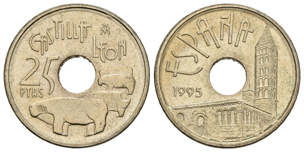 JUAN CARLOS I. 25 Pesetas. 1995. ERROR Castilla León sin la Y. JBM-91.2.7. Cu-Ni. 4,27g. MBC+/EBC-.