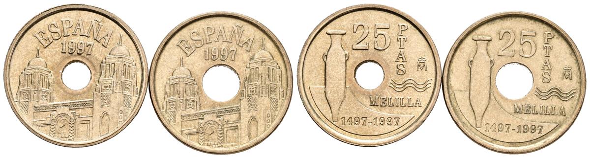 JUAN CARLOS I. 25 Pesetas. 1997. Variante con agujero central ligeramente más pequeño, acompañada de otra moneda normal para su comparación. 4,26g. SC.