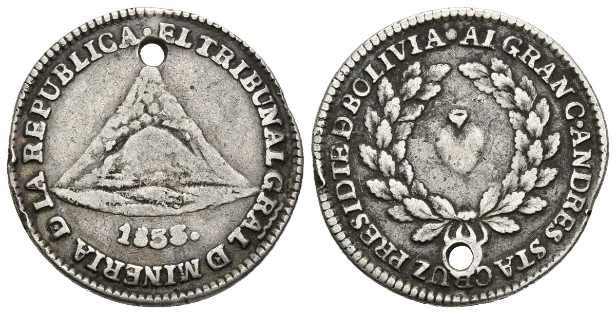 BOLIVIA. Medalla. 1833. A/ Cerro de Potosí, alrededor EL TRIBUNAL GRAL DE MINERIA DE LA REPUBLICA. R/ Corazón dentro de láurea, alrededor AL GRAN C. ANDRES STA CRUZ PRESIDENTE DE BOLIVIA. Burnett 10a. Ar. 3,36g. Perforación. MBC.