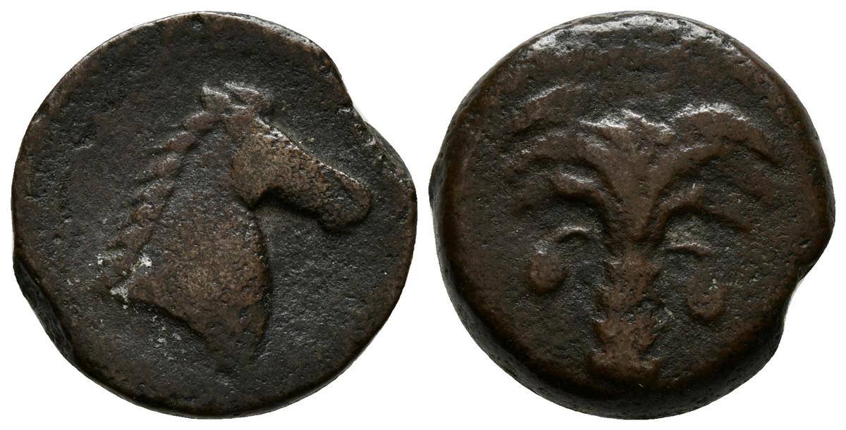 CARTAGONOVA. 1/2 Calco. 220-215 a.C. Cartagena (Murcia). A/ Cabeza de Tanit a derecha. R/ Palmera con frutos. FAB-519. Ae. 6,89g. MBC-.