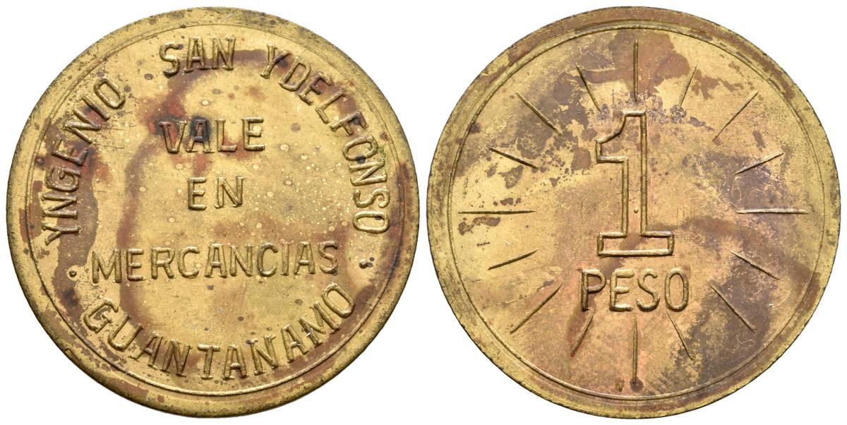 CUBA. Ficha 1 Peso. Vale en mercancías. YNGENIO SAN IDELFONSO. (Guantánamo). Latón. 6,23g. EBC.