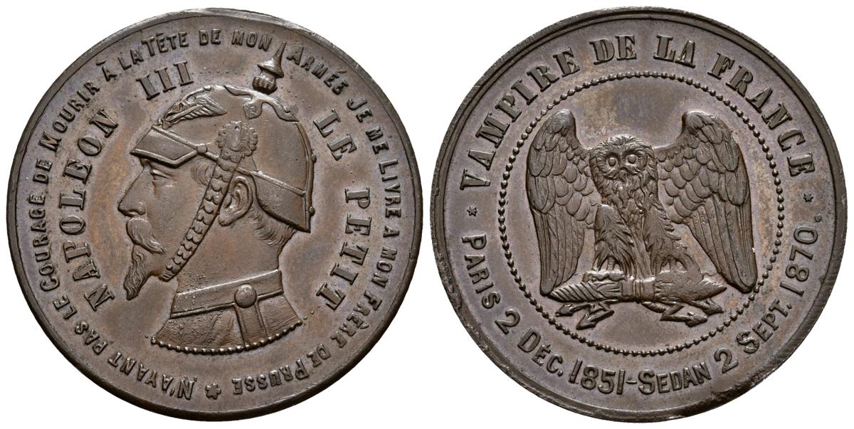 FRANCIA. Napoleón III. Jetón Antimonárquico. 1870. A/ Busto satírico con casco. R/ VAMPIRE DE LA FRANCE. Lechuza de frente. Coll-37. Ae. 11,26g. SC-.