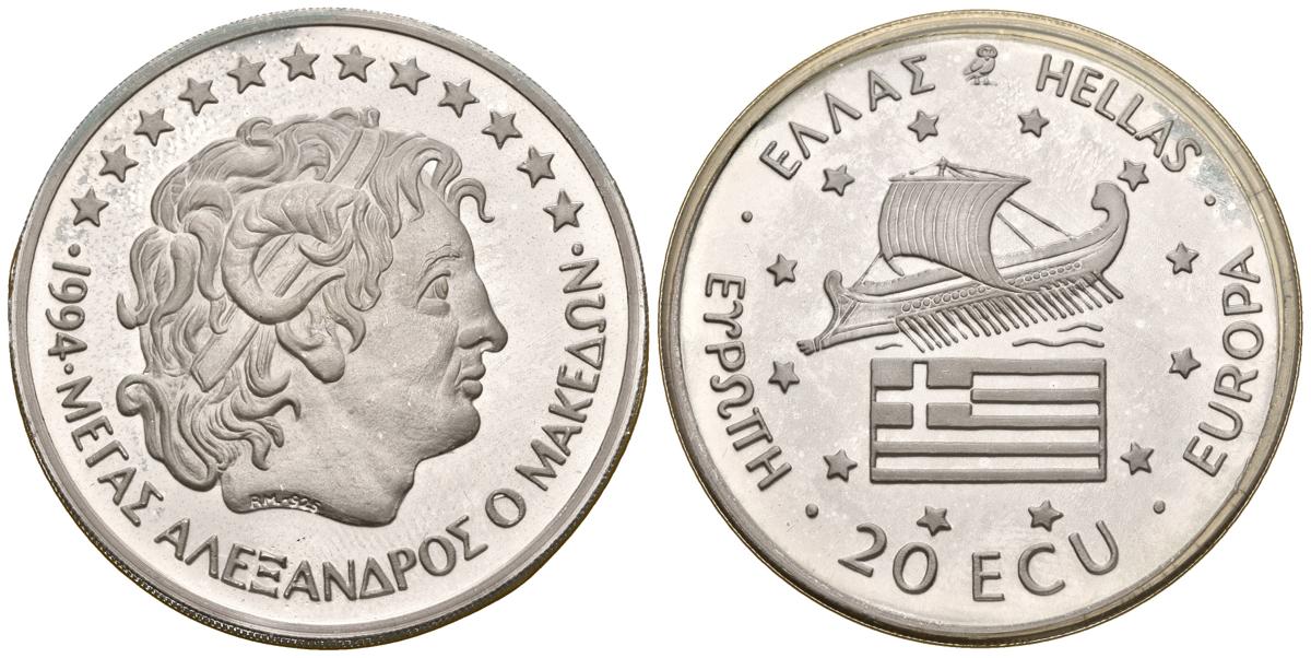 GRECIA. 20 Ecu. 1994. ALEJANDRO EL GRANDE (tirada: 1000 ejemplares). Ar. 47,10g. PROOF. Sin estuche oficial.
