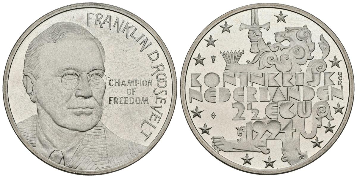 HOLANDA. 2 1/2 Ecu. 1994. FRANKLIN D. ROOSEVELT (tirada: 1500 ejemplares). Ar. 15,42g. PROOF. Sin estuche oficial.