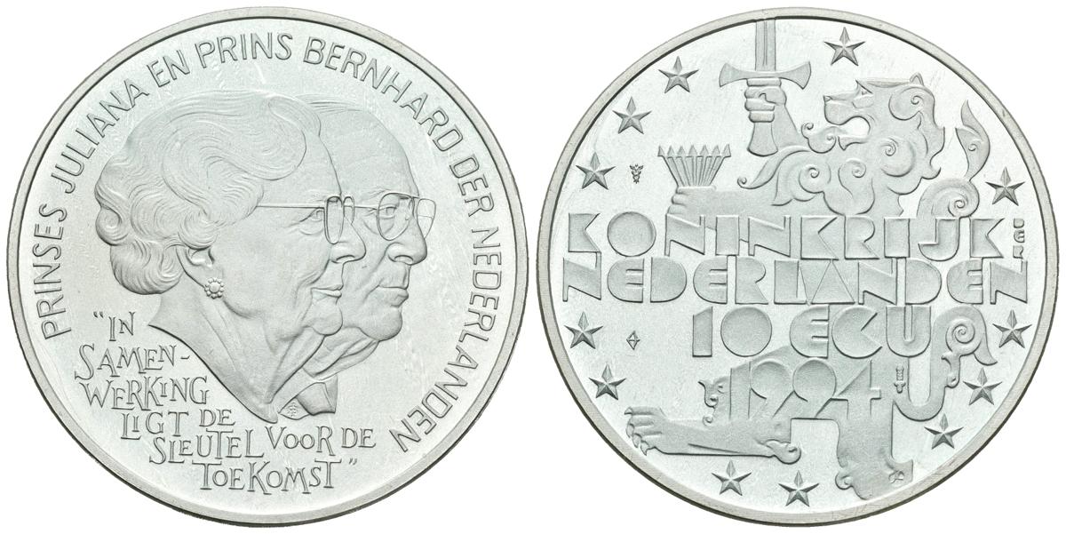 HOLANDA. 10 Ecu. 1994. JULIANA Y BERNHARD (tirada: 1500 ejemplares). Ar. 25,32g. PROOF. Sin estuche oficial.
