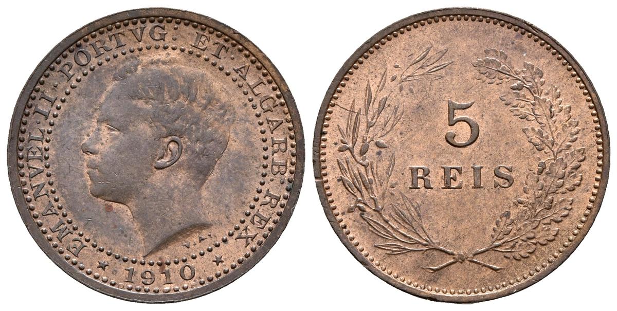 PORTUGAL. 5 Reis. 1910. Km#555; Gomes 01.01. Ae. 3,24g. Parte del brillo original. EBC/EBC+.
