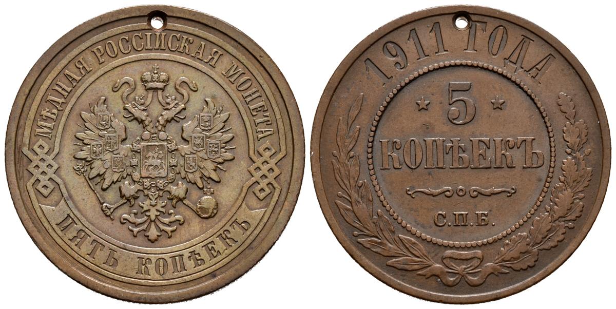 RUSIA. 5 Kopeks. 1911. St. Petesburg. Bitkin:210. Ae. 16,44g. Perforación. MBC+.